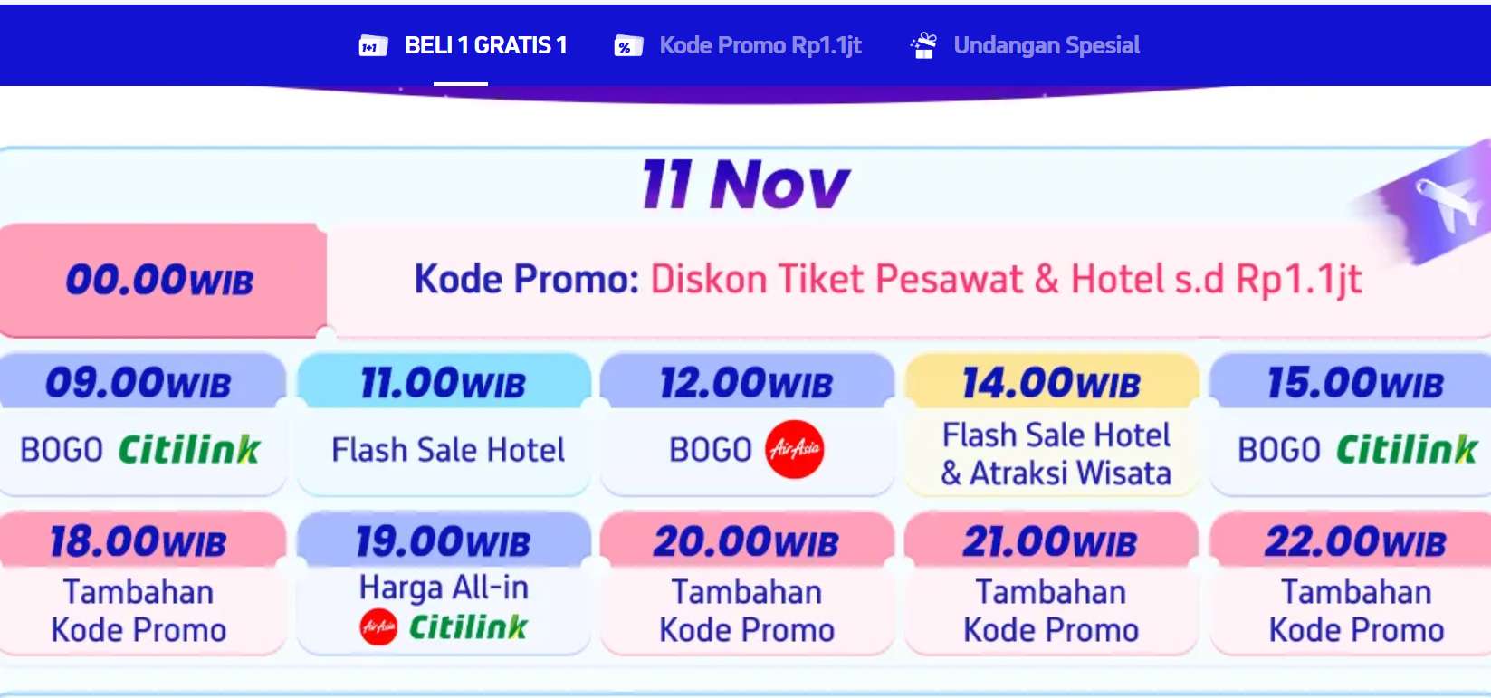 Nikmati Beli 1 Gratis 1, Flash Sale Setiap Hari mulai dari Rp411rb, dan kode promo hingga Rp1.1jt untuk Tiket Pesawat dan Hotel. Jangan sampai kelewatan!