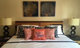 Main bedroom features beautiful ocean views, handcrafted king size canopy bed with luxurious linens, private access to veranda, attached main bath with oversized, walk in shower and Jacuzzi tub. Second bedroom features the option of king size bed or two twin beds, luxurious linens, and attached private bath with oversized, walk in shower. Have an extra person? Sofa also converts to a queen sleeper. No extra person charge for children 12 & under.