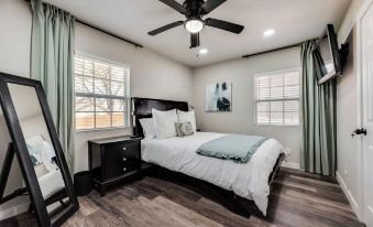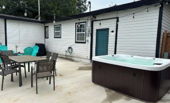 Relax in style with modern comforts including fast WiFi, smart TVs, a full kitchen, and in-home laundry. Step outside to your private patio with fire pit and outdoor dining area, the perfect spot to unwind after a game or concert.