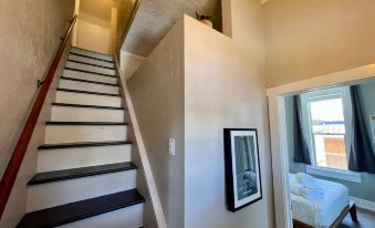 As you step inside, you'll immediately notice the unique character and inviting ambiance of the space. The living area features exposed brick walls that exude warmth and lend a touch of history to the home. Sink into the cozy sofa, or snuggle up in the oversized bean bag, and unwind after a day of travel and/or exploration. Watach your favorite TV show or enjoy a good book by the large windows, allowing natural light to fill the room.
