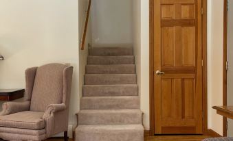 Our one bedroom one bath appartment has a full kitchen and living room area on the first floor. The second floor has another sitting area, a king size bed and full bathroom. The couch on the first floor is a full size pull out if needed.