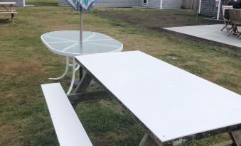 The retro bathroom (circa 1950) has a full tub/shower. There is an outdoor shower as well. Speaking of outside, there is a front deck where my guests like to hang out, have a cocktail and watch the sunset. In the back yard, there is a new patio with a private grill and plenty of seating for dining, relaxing and entertaining.