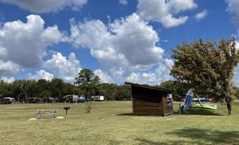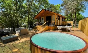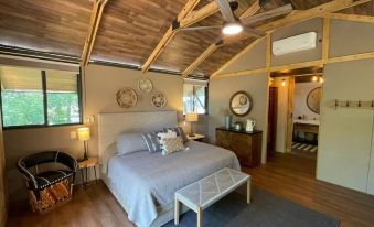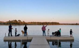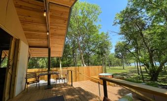 Enjoy nature and the beautiful shores of Lake Bastrop without the inconveniences of camping. Combining luxury with nature, this cabin sleeps six comfortably with custom furnishings, stylish decor, and your own private restroom with a large vanity and shower.