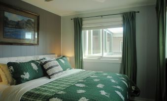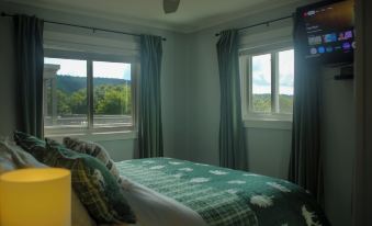 The Master Bedroom with en suite bath features a Queen size bed, dedicated workstation, TV, black-out curtains, and large closet.