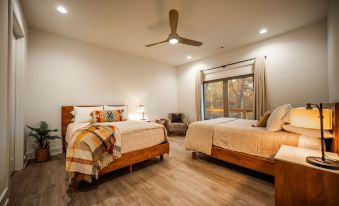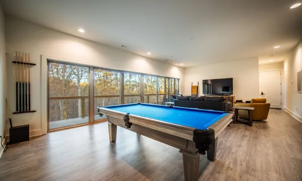 Designed with both adventure and recovery in mind, Pedal & Plunge features an open, airy layout with expansive glass windows that frame breathtaking views of a lush 40-foot oak tree forest behind the house. Inside, you'll find stylish, modern decor with a mountain biking theme that perfectly complements the natural surroundings. Whether you're gathering in the spacious living area or enjoying a quiet moment on the private deck, you'll be enveloped by beauty and tranquility.