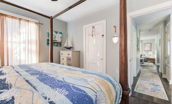 Master bedroom has a King Sized bed on an extremely sturdy frame, with no wobbles or creaks. Get a seriously comfortable nights sleep. On either side of the hallway are the 2nd and 3rd bedrooms. #2 is the flamingo room, with a super comfy queen bed, quiet and peaceful. #3 is the anchor room / office. Including a desk, computer monitor, and printer. The bed is a full that can fit 1 person comfortably.