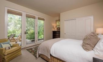 The entire length of the house opens in the back to large glass views of the secluded yard and patio which is protected by a private, riverfront estate, set amongst aspen and cottonwood trees. The patio is furnished with comfortable new outdoor furniture, including dinner seating for 8. Public fishing access to the Big Wood River is just one block away as is access to 50 miles of public paths for biking, walking or skate skiing. The house is 2 miles from River Run ski lodge and 2.75 miles to the center of downtown Ketchum.