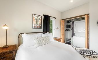 Bedroom: The bedroom offers a queen-size bed, comfy bedding, Smart TV, side tables with lights, closet, and laundry facilities. In the colder months, the room Is heated with a portable heater.