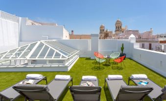 This three-story building in the heart of Cádiz offers charming tourist apartments. It stands out for its bright Andalusian patio with palm trees, an elevator that takes you to the rooftop terrace, equipped with sun loungers and a laundry room.