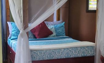 Right in the Shay studio: enjoy a four-pole wheel bed lined with mosquito nets with his and her compartments. This bed is on wheels and can be relocated in your space to your liking.