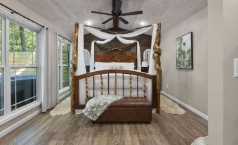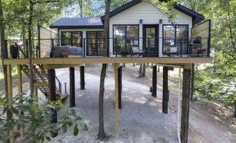 The TWISTED SASSAFRAS TREEHOUSE is a brand-new custom-built treehouse located on 10 acres with a water view. It is nestled high in the trees and is the perfect romantic getaway for two! Enjoy the beautiful sunsets and sunrises while sitting on the deck. Cozy up in the 4-poster king size bed, snuggle up by the fireplace, relax in the hot tub on the deck or toast your feet by the firepit below. We also offer catch & release fishing!