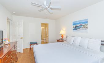 Bedroom 1: This bedroom is considered the master and features a king-sized bed, dresser and walk in closet for storage, ceiling fan, work desk, flat screen TV, access to the private balcony, and access to the ensuite bathroom. The bathroom features a standing shower with sliding glass doors, vanity with a large mirror, and toilet.