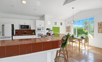 The open floorplan is perfect for entertaining and gathering with a lovely light-filled living room with beautiful furnishings, fireplace and flatscreen TV. Cheery and bright with colored tiles and palm tree views, the cook in the group will love preparing meals in the fully equipped kitchen. Enjoy a casual meal at the counter or gather around the sleek dining table that seats 6 and recount the day’s adventures.