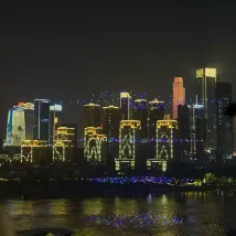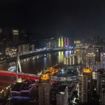 Kamar ini memiliki jendela besar dari lantai hingga langit-langit. Saya mengambil gambar pemandangan malam hari. Pemandangannya sangat indah. Saya melihat pemandangan Chongqing yang makmur.