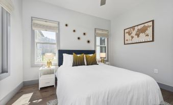 20ft ceilings make for a spacious modern king bedroom with a large bathroom/shower with all the luxury amenities you could want.
