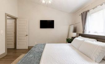 -a primary bedroom with a tempur pedic king bed, smart tv and en suite full bathroom and closet organizers