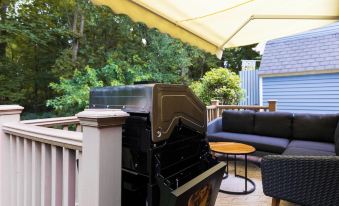 -Deck with fire table, corner sectional, and grill. The deck can be shaded with a roll out awning above.