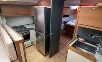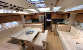 The internal offer great comfort and brightness, a large living room with kitchen area towards the bow, 3 double cabins for guests and in the living room the sofa is convertible into a double bed. There are 2 bathrooms with a separate shower box and electric toilet.