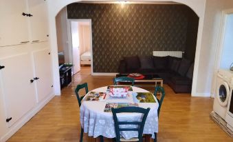 * a large room of 35 m² with convertible sofa, TV, internet, coffee table. a fully equipped kitchen area (dishwasher, washing machine, fridge freezer, microwave, electric stove, etc.). A children's high chair.