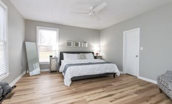 The Man O’War is your perfect luxury modern getaway to explore all that Kentucky has to offer. Open spacious living room with 12-foot ceilings with original molding, fully stocked kitchen, Lux king memory foam mattresses with toppers, Smart TV along with high-speed internet, and a fully fenced in backyard firepit area and a picture-perfect mural!