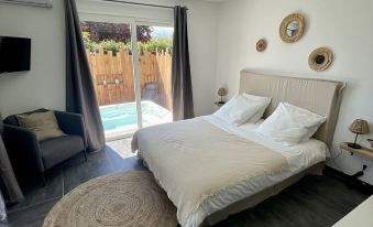 3 air-conditioned double bedrooms equipped with 160x200 beds, cupboards, connected TV including a parental suite of more than 20m² with bathroom including balneo bath, Italian shower, hair dryer and toilet opening directly onto the covered terrace and the swim spa (swimming pool )