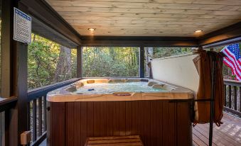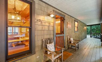 Step outdoors into a private oasis. Dine on the uncovered front patio, complete with a gas grill and seating for six. The screened-in porch offers a hot tub for unwinding after a day of adventure. For those who enjoy riverside relaxation, the back deck is equipped with a porch swing, a dining area, loungers, Adirondack chairs, and a firepit for cozy gatherings. Unwind on the riverfront deck with a dining table and glider which offers a peaceful spot to take in the river views or cast away the hours fishing for trout.