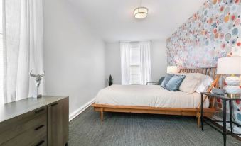 Private driveway with plenty of parking. Large backyard leads to the entrance. Keyless entry. Fully stocked eat-in kitchen. Cozy living room with sitting area. Office space with desk. Master Suite with queen bed and attached half bath. Second bedroom with queen bed plus a full bathroom and washer & dryer in hallway closet.