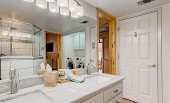 There are two master bedrooms on the main floor, guest should be aware that there are two steps up to be taken to enter the master bedrooms and bath. There is a grab bar at the entry of the rooms if needed. Smart Televisions are in these bedrooms as well as ceiling fans. The bedside lamps in each room feature USB ports and 110 outlets for your electronic charging needs. The large master bathroom with laundry area is accessed by both master bedrooms in a Jack n' Jill style. This is the only bathroom on the first floor.