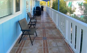 Upstairs balcony extends width of property and contains a BBQ and seating area.