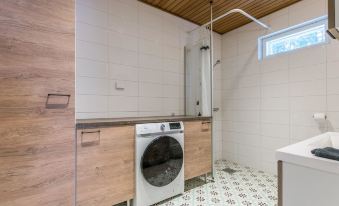 By the lake, there is a log-built lakeside sauna with a wood-heated sauna stove equipped with a water tank. The sauna also has a separate dressing room. The spacious gravel-covered plot is located in a peaceful area at the end of a private road. The nearest neighbor is 190 meters away. The large yard offers ample parking space for multiple cars. Electric vehicle charging is available from a standard power outlet free of charge, upon agreement with the owner.