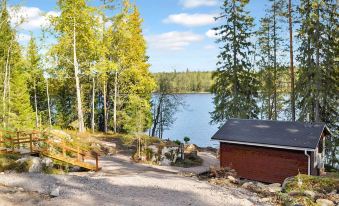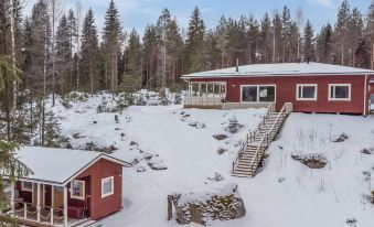 This wooden villa is situated on the shores of Lake Kuusjärvi, on a flat plot with a sandy beach, making it suitable for children. The log-built lakeside sauna enhances the lakeside experience. A long staircase leads from the main villa down to the lakeside sauna and the shore.