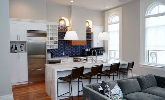 Enjoy stunning views of the Rock River from this spacious loft sitting atop a historic brick Italianate-style building erected in 1865. Located in the heart of downtown Janesville, there are endless locally-owned shops and restaurants within walking distance- including Genisa Wine Bar, an Italian-inspired bar and restaurant just downstairs on the first floor (with free delivery!) Although the building is more than 150 years old, it's filled with modern luxuries. All bathroom fixtures are the latest available from Kohler, including a smart toilet and a high-pressure rainfall showerhead. All appliances are from Sub-Zero, Wolf, and Cove, including a 24-bottle wine chiller. The living room and both bedrooms feature large smart TVs, and the entire space is filled with contemporary decor. Please note this property is not handicap accessible. This rental is available for short and long-term stays. Start your Wis-cation here!About pets:No pets allowed.About checkOut:Check out before 11:00 AM.About children:Children allowed: ages 0-17.About checkIn:Check in after 4:00 PM.About smoking:Smoking is not permitted.About minBookingAge:Minimum age to rent: 18.About events:No events allowed.
