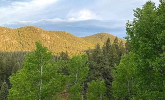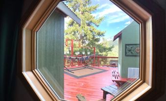 Our neighborhood is located on an improved dirt mountain road and may require 4WD or AWD during inclement weather. We have a steep, narrow driveway, but plenty of room in the parking area. Enter the space next to the right by the log fence and go down the flight of curved stairs to the lower level. Walk across the lower deck where you can access the walkout basement apartment through the portico with glass door, next to the carved tree.
