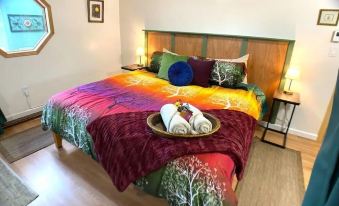 Use keypad to enter into large bedroom with one king size bed and one twin daybed with a pullout twin trundle (total of two twin beds). Large closet area, curtain room divider, private bathroom with tub/ shower. Big screen smart TV with Firestick, wall heater/ faux fireplace, electric baseboard heater with thermostat. Portable fans, room divider for privacy or to block sunlight.