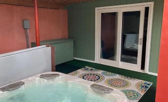 Open barn door to hallway where you'll pass a private storage and community laundry room leading to the main living space. Here, you can relax on the large L-shaped couch for lounging, big screen smart TV, dartboard, various puzzles and games, DVD, VHS, CDs for your entertainment. Electric pellet stove/ fireplace and electric baseboard heater. Sliding glass doors leading outside to lower deck and BBQ, second sliding door leading out to jacuzzi hot tub.