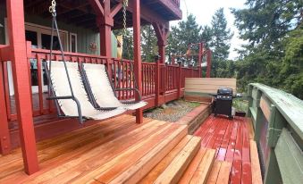 Outdoor patio with furniture including Adirondack chairs with table, rockers, bistro table with chairs, hammock (in summer), double swing chair, outdoor heater and gas BBQ.