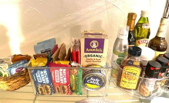 Office area includes desk with chair, Wi-Fi printer and a shredder. There are maps and information for local hiking, dining and shopping along with our guest book. Dining table seats four leading to Kitchen with refrigerator/ freezer, microwave, coffee maker, coffee grinder, coffee beans, cookware, dinnerware, utensils, glasses, mugs. We supply condiments and snack bars and some comfort foods.
