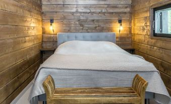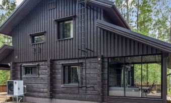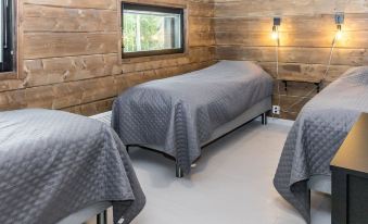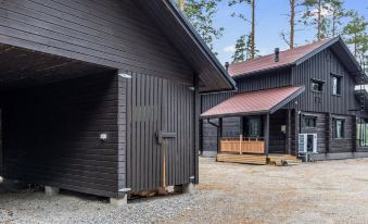 The main cabin’s ground floor features a modern living room/kitchen, a separate WC, and a bedroom with two single beds. On the upper floor, there are two bedrooms: one with a double bed and the other with three single beds. The main cabin has two spacious covered terraces, one enclosed with glass. The sauna building includes a dressing room, a separate washroom, and a wood-heated sauna. Additionally, there is a woodshed and a carport near the cabin.