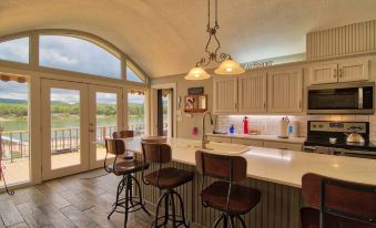 Relax in a spacious sectional in the living area, featuring double arched ceilings, a 55” smart TV and a ping pong table. Plenty of seating is provided for meal times, including 5 stools at the kitchen bar/island and a dining table with seating for 8.