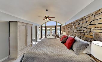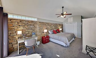 The Master suite has a king sized bed, work area with desk and chair, smart TV and an en suite bath (also accessible via the hallway) with two vanities and a large walk-in shower with three showerheads! This bedroom also features an entire wall of Blanco River rock, proving to be a most unique “headboard” for the king sized bed.