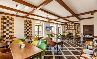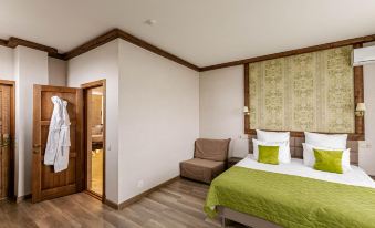 The hotel is designed in a chalet style using natural materials in the decoration and interior. The hotel offers 30 rooms of various categories: from standard rooms with a private bathroom to spacious suites with stunning panoramic views of the city. The rooms are equipped with modern furniture, TV, mini fridge.