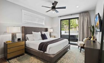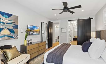 The primary king suite is on the main floor and has a king size bed, 42" Smart TV and large slider door with private access to the back yard and hot tub. The attached bath has heated floors, a walk-in shower, double sink vanity, and a walk-in closet.