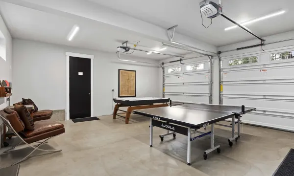 The 2-car heated garage is converted into a game room with a ping pong table, air hockey and corn hole.