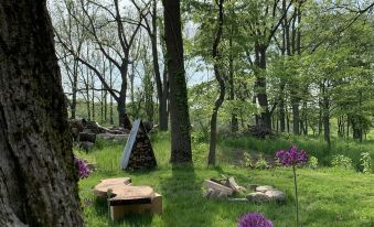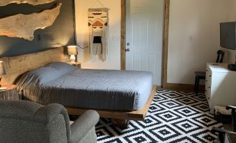 The Sanctuary is located in a wonderful blend of farm and nature for a peaceful getaway. It was designed and handcrafted by your hosts to reflect the peacefulness of a simple farm life while giving you the amenities of modern life. Inside: Designed in a studio style it features a soaking tub with hand shower, a full kitchen, a custom queen bed with an Organic mattress and a comfy couch to watch tv as you enjoy the comfort of in-floor heating or A/c.