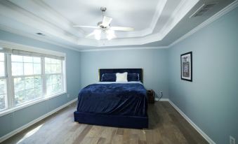 Bedroom 1: This is our spacious and bright master bedroom. Located on the second floor, it has a king-sized bed, with a luxurious California King mattress, offering a truly indulgent sleep experience. It has a full bathroom, closet, 75-inch TV with internet access, Netflix, and indulge in the Jacuzzi for ultimate relaxation.
