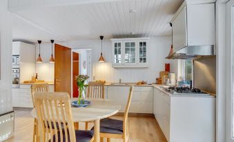 Single-family house, built in 1968. Private: natural state property 2'588 m2. Terrace (10 m2), barbecue, parking at the house. E-charging station. Grocery 4 km. Golf course 11 km. The owner does not accept any youth groups. "Freda" - 100m to the fjord", 3-room house 76 m2. Object suitable for 3 adults + 2 children. Living room with TV, radio, CD-player and hi-fi system. 1 room with 2 beds. 1 room with 1 bed. 1 room with 1 x 2 bunk beds. Kitchen (oven, dishwasher, 4 induction hot plates, microwave). Shower/WC. Terrace 15 m2, roofed. Of the bay. Facilities: children's high chair. Internet (WiFi). Please note: non-smokers only. 820-6845
