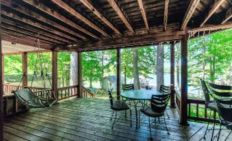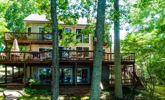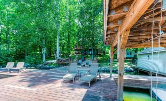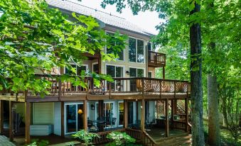 Treat the whole family to an unforgettable getaway and make this stunning lakefront retreat home! Featuring two wraparound decks, a balcony, and a private dock with a diving board, this home is perfect for spending endless days outside in the fresh air. Not to mention, a gas grill awaits for a classic summer cookout in the sunshine! Though everyone will love the great outdoors, the interior of this home is just as fun with a well-decorated, modern look throughout the three levels, a fully equipped kitchen, a formal dining area, and a game room complete with a TV, a kitchenette, and a foosball table! Each night can end with the colors of the sunset over the beautiful water and everyone will love gathering at the firepit until the stars come out! The private dock is a hit, especially among children! It's perfect for sliding, diving boarding, swimming, kayaking, and so much more! For older folks, it offers great fishing opportunities.