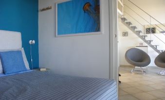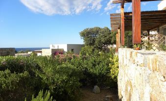 Surrounded by the Mediterranean scrub, mini villa composed by a unique ambience open space with fully equipped kitchen corner, living /dining area, two armchairs, and tv; main bedroom with a queen-size bed and bathroom with bidet and shower. On the mezzanine floor (above the living area) there is the second bedroom with a queen-size bed. The mini villa offers also a large covered veranda equipped with a table, chairs, and sunbeds to enjoy sunsets at its best!!!
