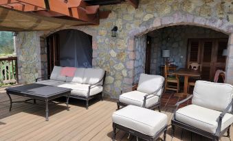 The pool has a large sunning deck with chaise lounges and a covered lower deck nested in the shade of the magnificent trees in the front garden. There is an outdoor cooking area with grill and dining area.