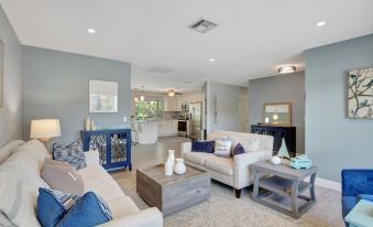 King bed in master with walk-in closet & ensuite that opens to lanai. 2nd bedroom with queen bed, 3rd bedroom with twin beds. 2nd bathroom with shower/tub combo. Open concept living/dining/kitchen area that extends to lanai. Bonus bedroom with daybed and ensuite bathroom. Extra family room, opens to lanai area and outdoor dining. Garage with beach gear.